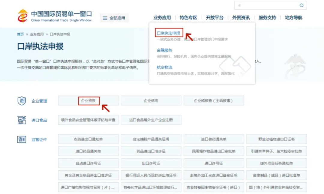 (二)点击上方“业务应用”—“口岸执法申报”,点击“企业资质”进入。