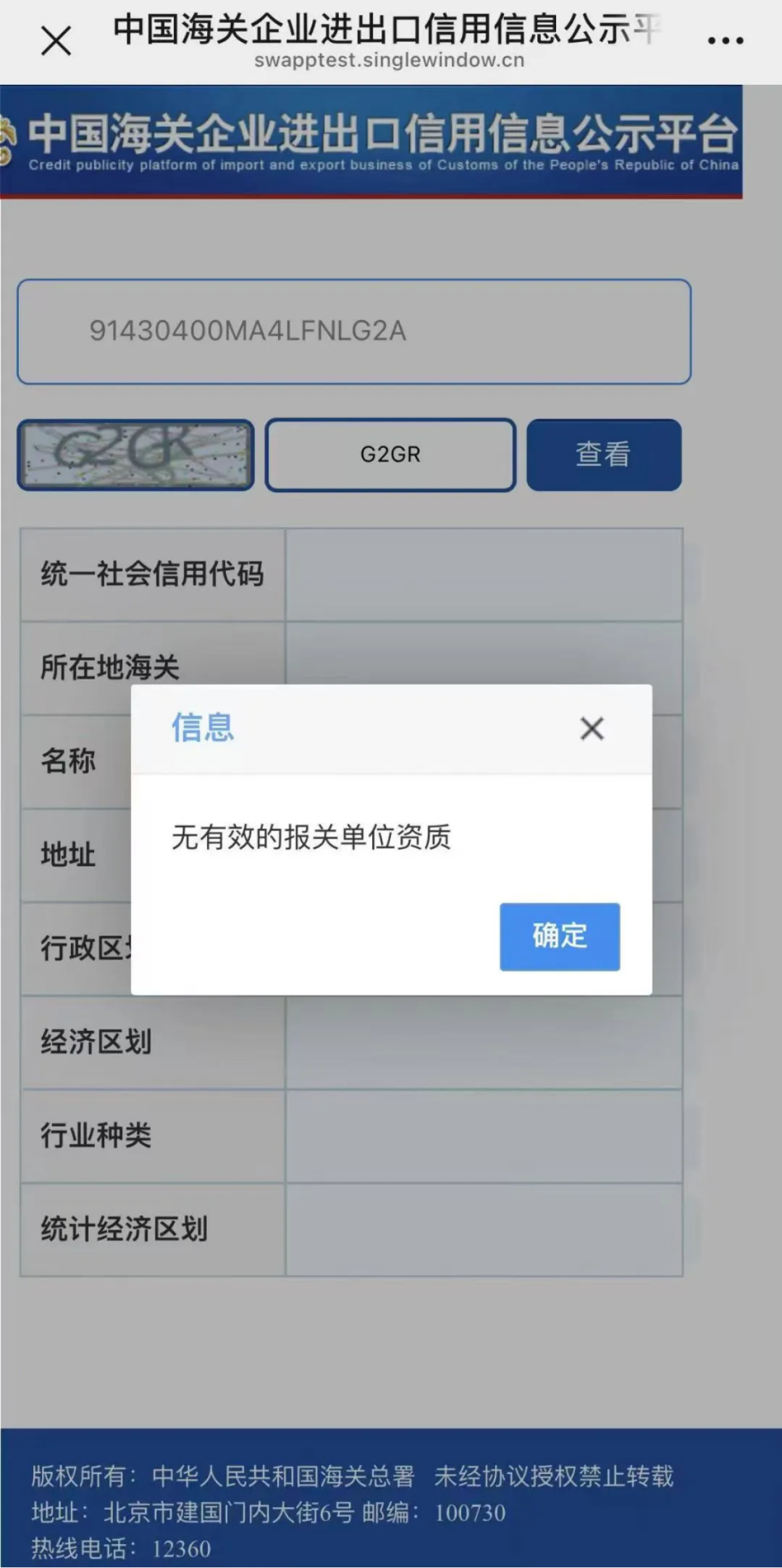 (二)如未备案有效报关单位资质,扫码查询后则会显示“无有效的报关单位资质”,如下图所示: